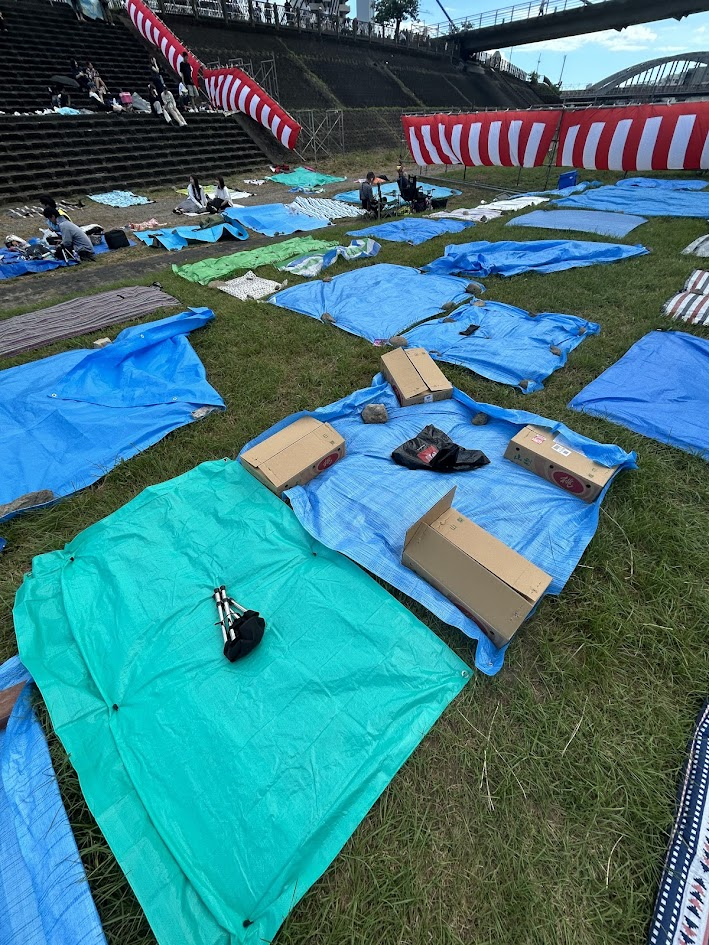 そしてもうひとつ。風が強い日には、シートの固定が必須だ。夕方の時点でも、レジャーシートがふわりと浮く瞬間が何度かあった。ガムテープで四隅を押さえる人もいたが、地面の相性によっては剥がれてしまう。そこで役に立ったのが、ペグ(固定用の杭)。私は沼津駅のCanDoで数本購入し、四隅と辺の中点に打ち込んだ。これだけで風のストレスがほとんど消える。荷物の置き方を工夫するよりも確実で、座っている間に何度も位置を直す手間も省けた。会場の空気は穏やかだが、自然の要素は容赦ない。準備の小さな工夫で、滞在の質は大きく変わる。